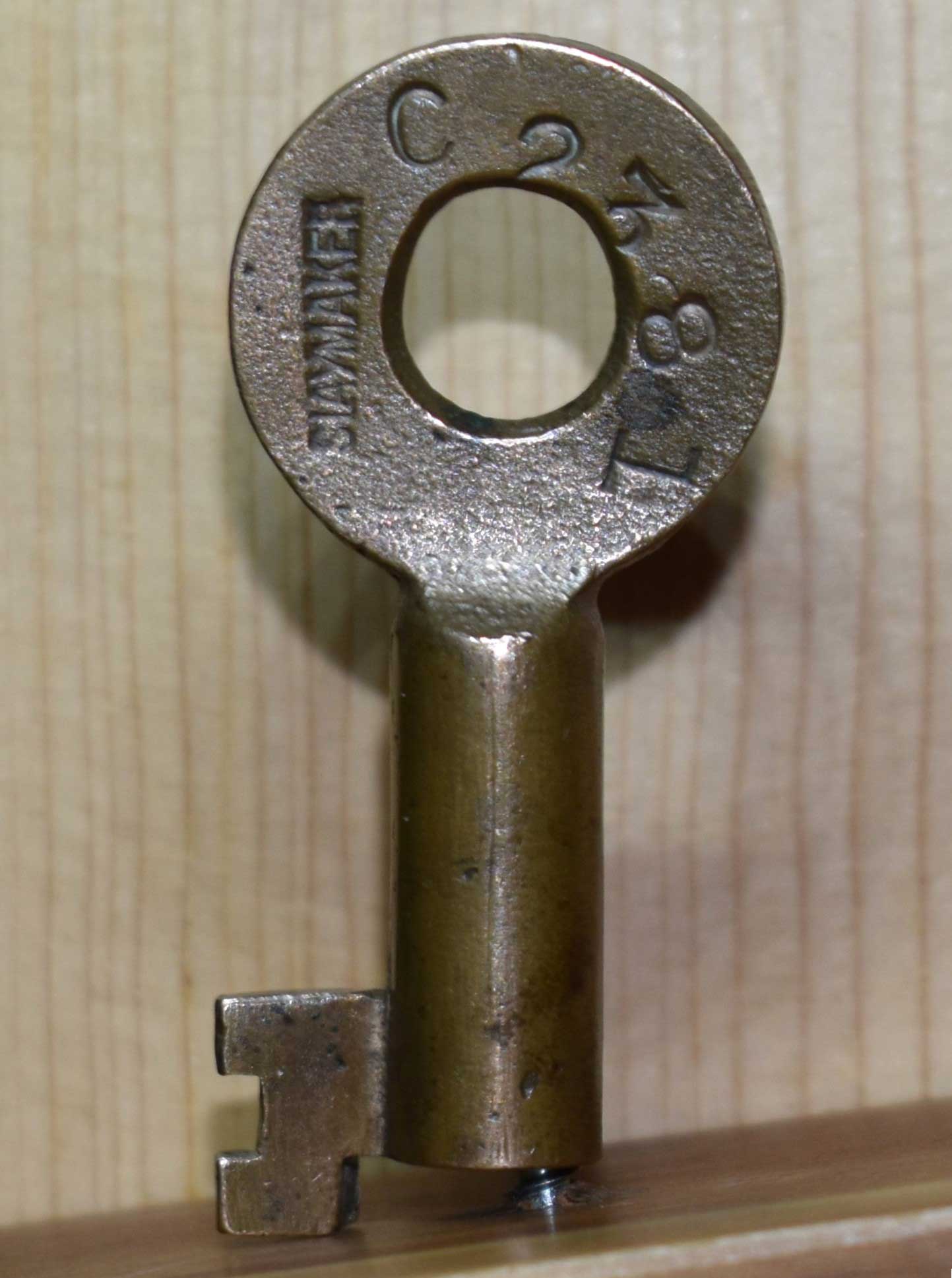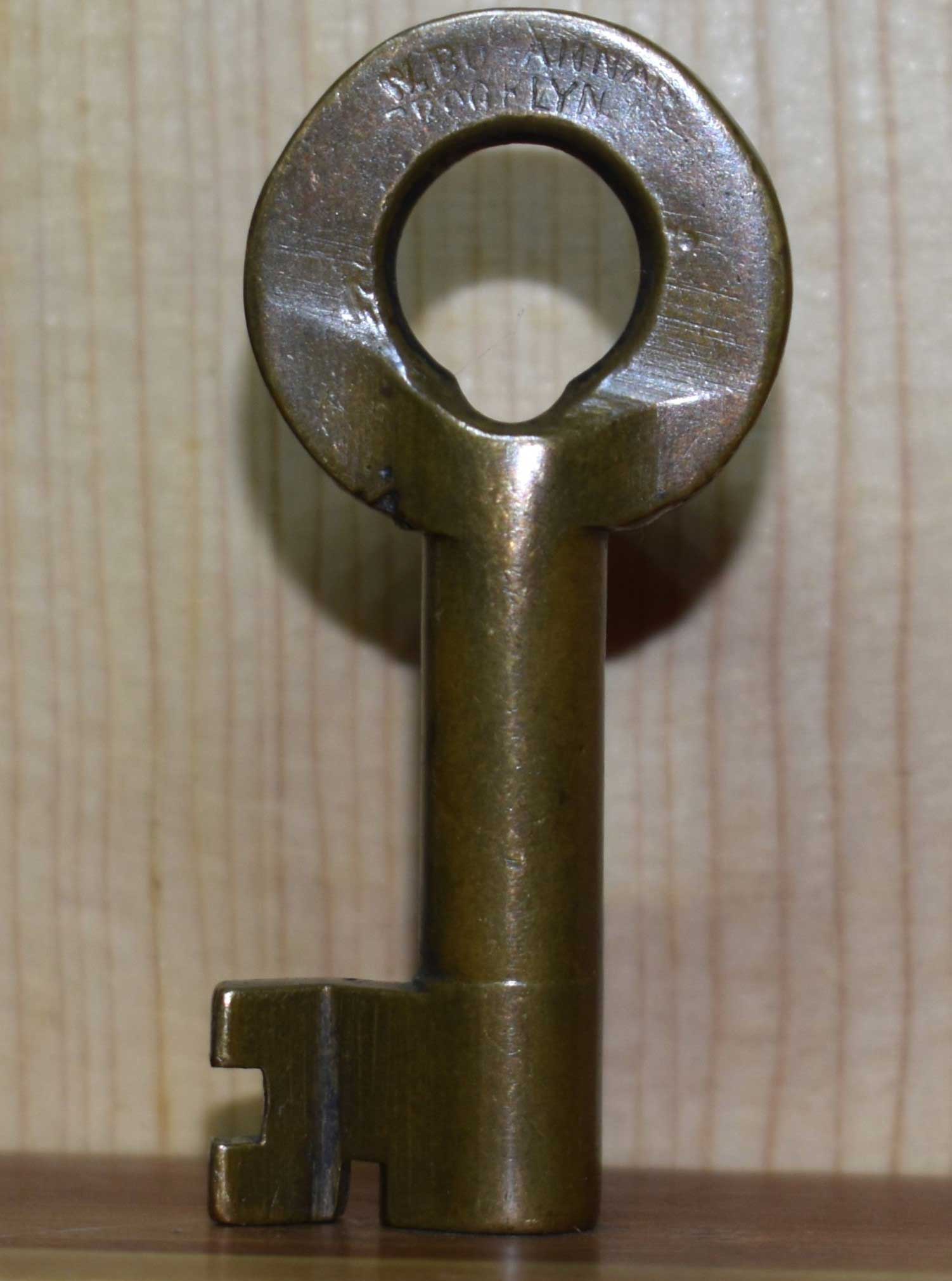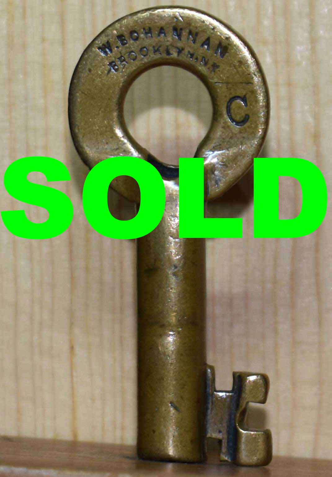 Remarks: ca. pre-1927 Forged by the Wilson Bohannan Co. Attractive stamp marks and gold patina. NOT a car key (C) same style cut as HV key below. 100 year+ centenarian!